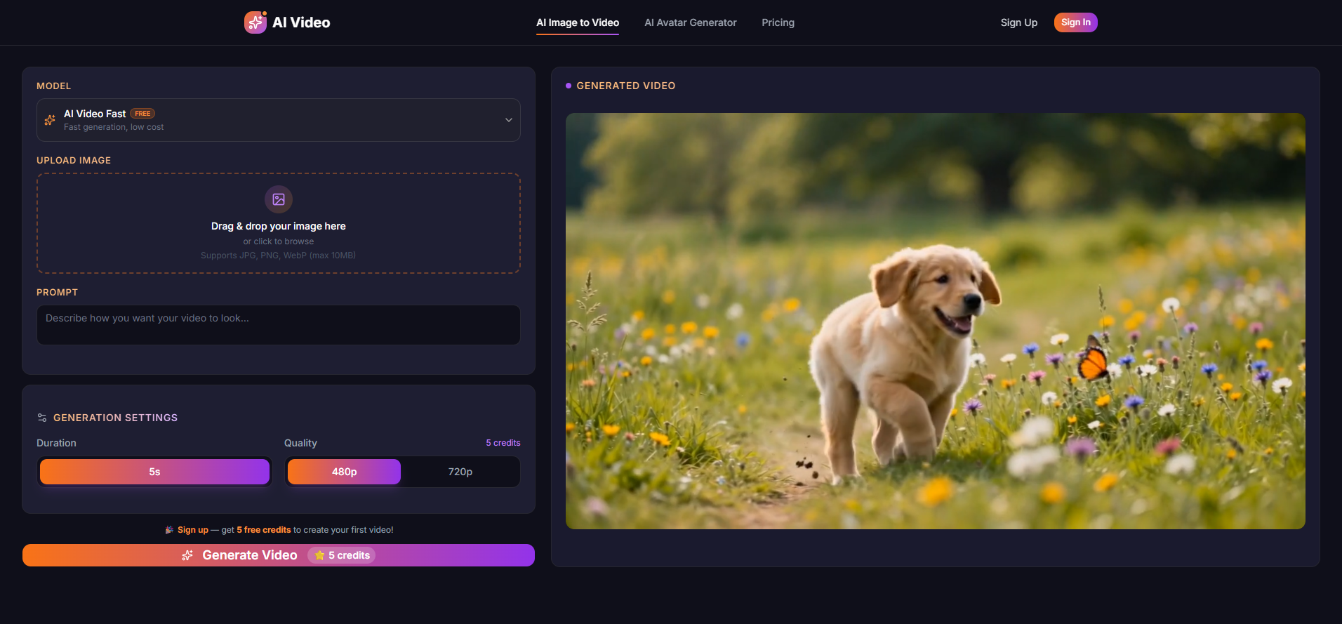 - Free Credits on Signup: Get 5 free credits upon account creation to start generating videos.