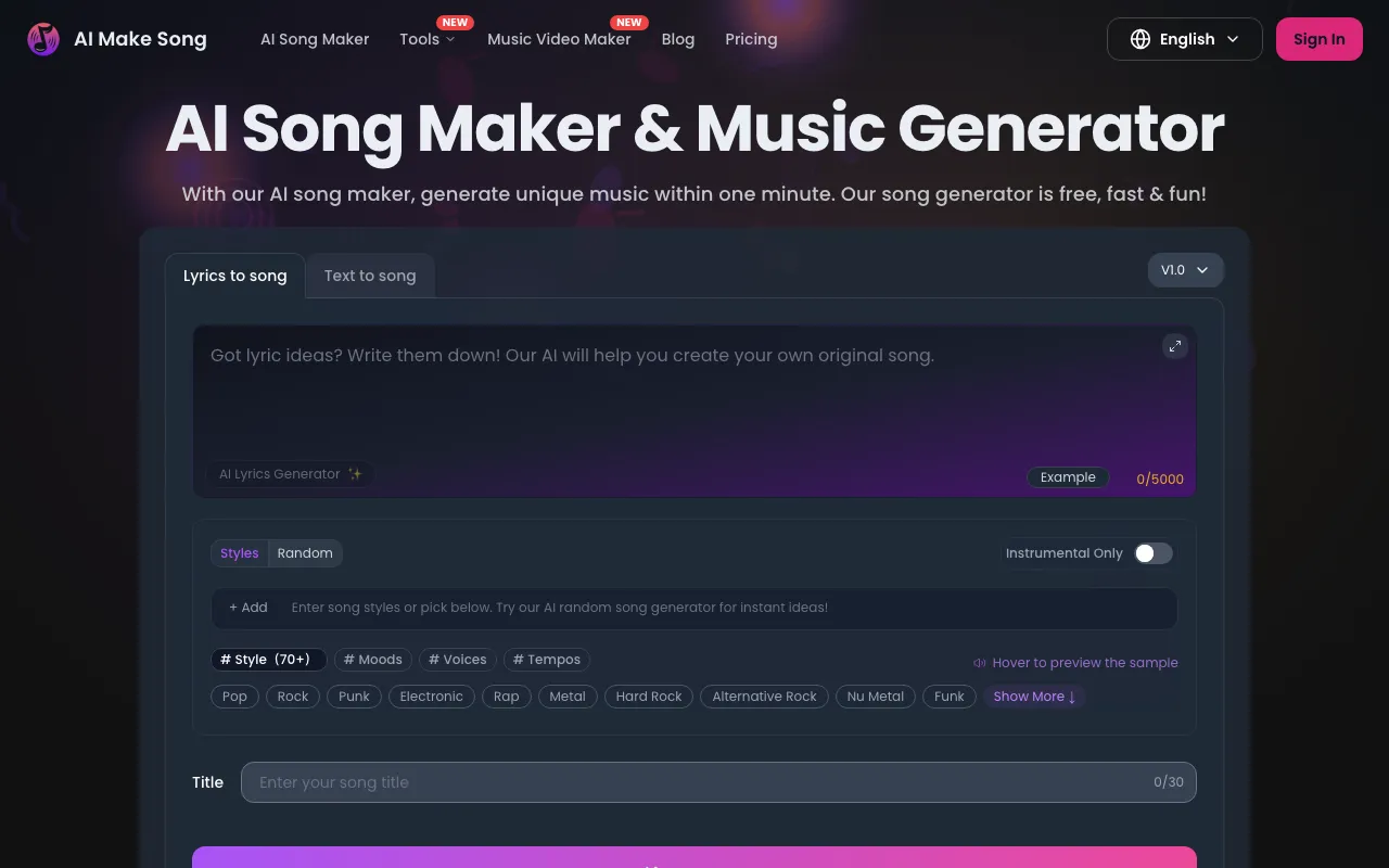 AI Make Song is an all-in-one AI music production platform designed to make music creation fast, fun, and accessible for everyone. Whether you are a content creator, game developer, or just having fun, this tool allows you to transform simple text descriptions or written lyrics into full, original tracks across over 70 genres—from Pop and Rock to Electronic and Rap.