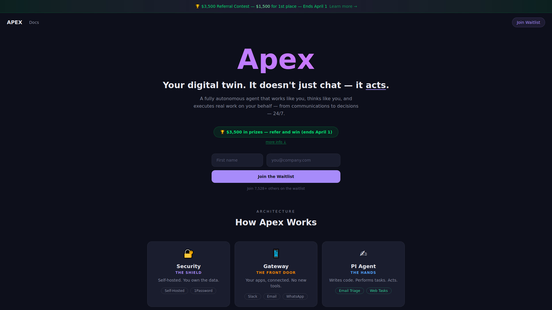 To join Apex, users can enter their first name and email address into a form on the website to join the waitlist. The website also mentions "Docs" which may contain further usage information.