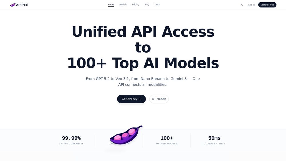 APIPod is a high-performance AI API aggregation platform that provides unified access to over 100 top AI models from various providers like OpenAI, Anthropic, and Google. It offers intelligent multi-channel routing, circuit breaker protection, and flexible billing, aiming to provide a price-performance advantage.