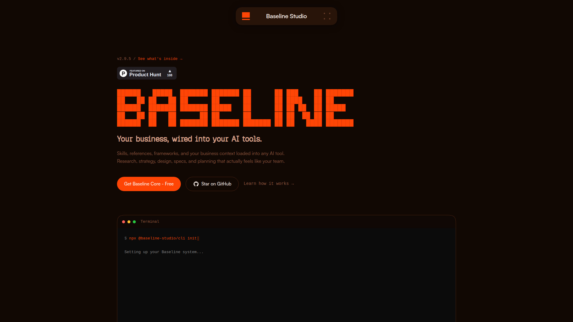 - What is Baseline Core? An AI-powered product system that takes you from idea to engineering-ready. It includes 12 skills, 14 frameworks, and 34 reference files covering research, strategy, specs, design, planning, and more. It's delivered via CLI and loaded into any AI tool, and it's free to use.