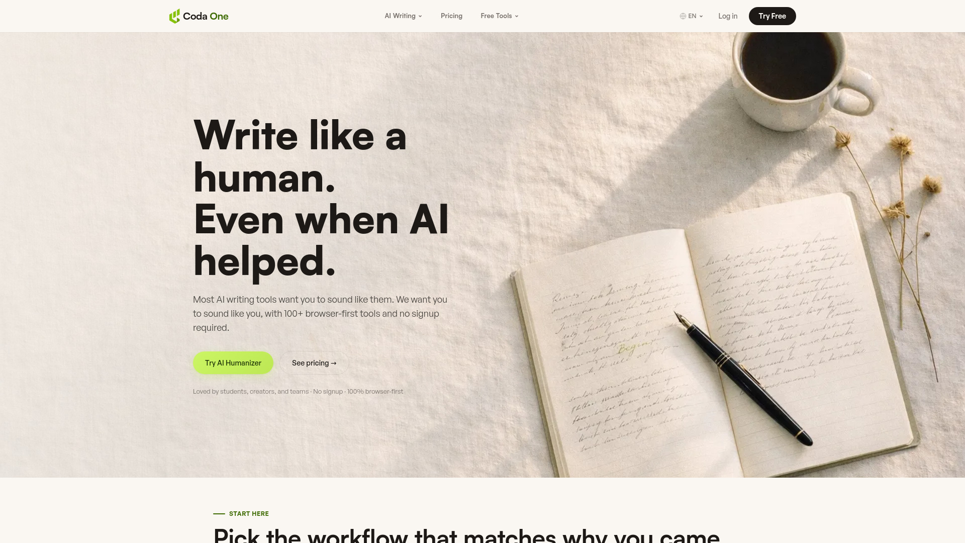 Coda One is a web-first workspace offering a suite of tools designed to enhance writing and productivity. It focuses on humanizing AI-generated text to make it indistinguishable from human writing, significantly reducing AI detection scores. Beyond AI writing assistance, Coda One provides over 100 free browser-based tools for PDF manipulation, image editing, developer utilities, and video processing, all accessible without requiring a signup or file uploads, running entirely within the user's browser.