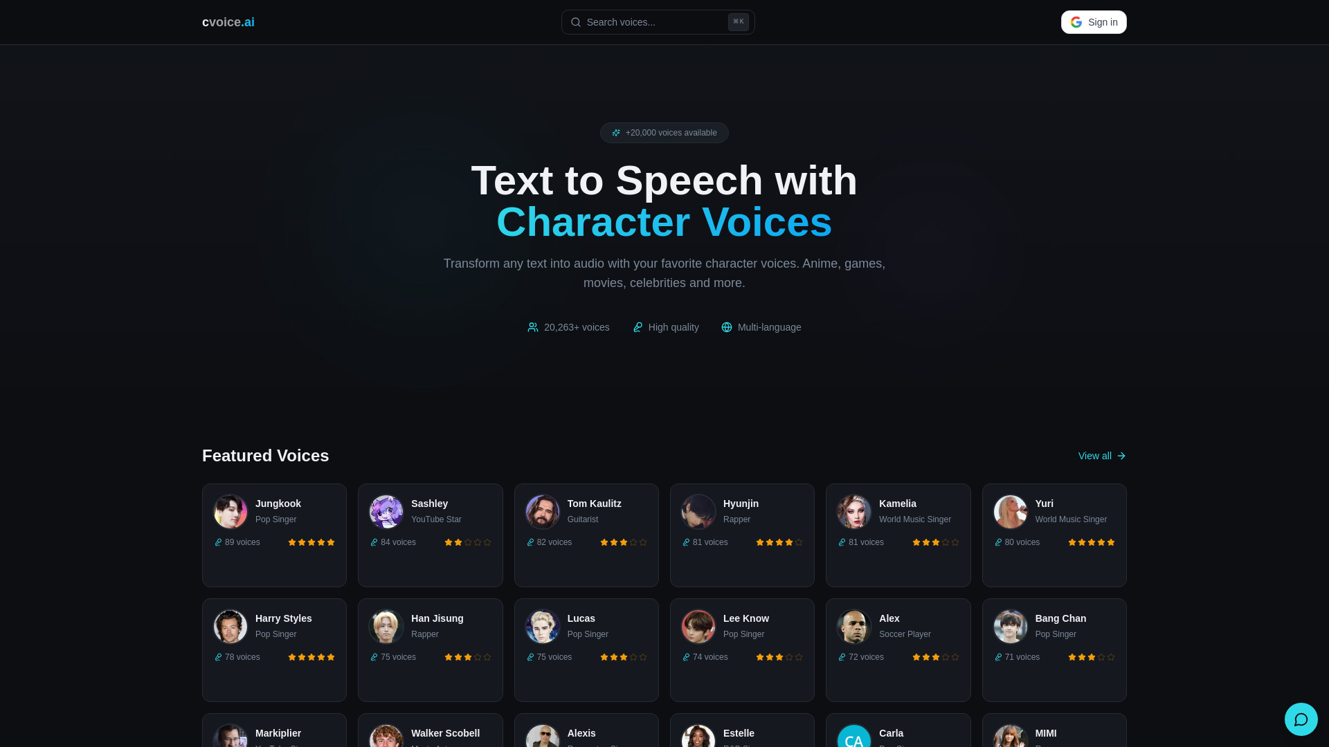 AI text-to-speech platform with 20,000+ character and celebrity voices for professional audio.