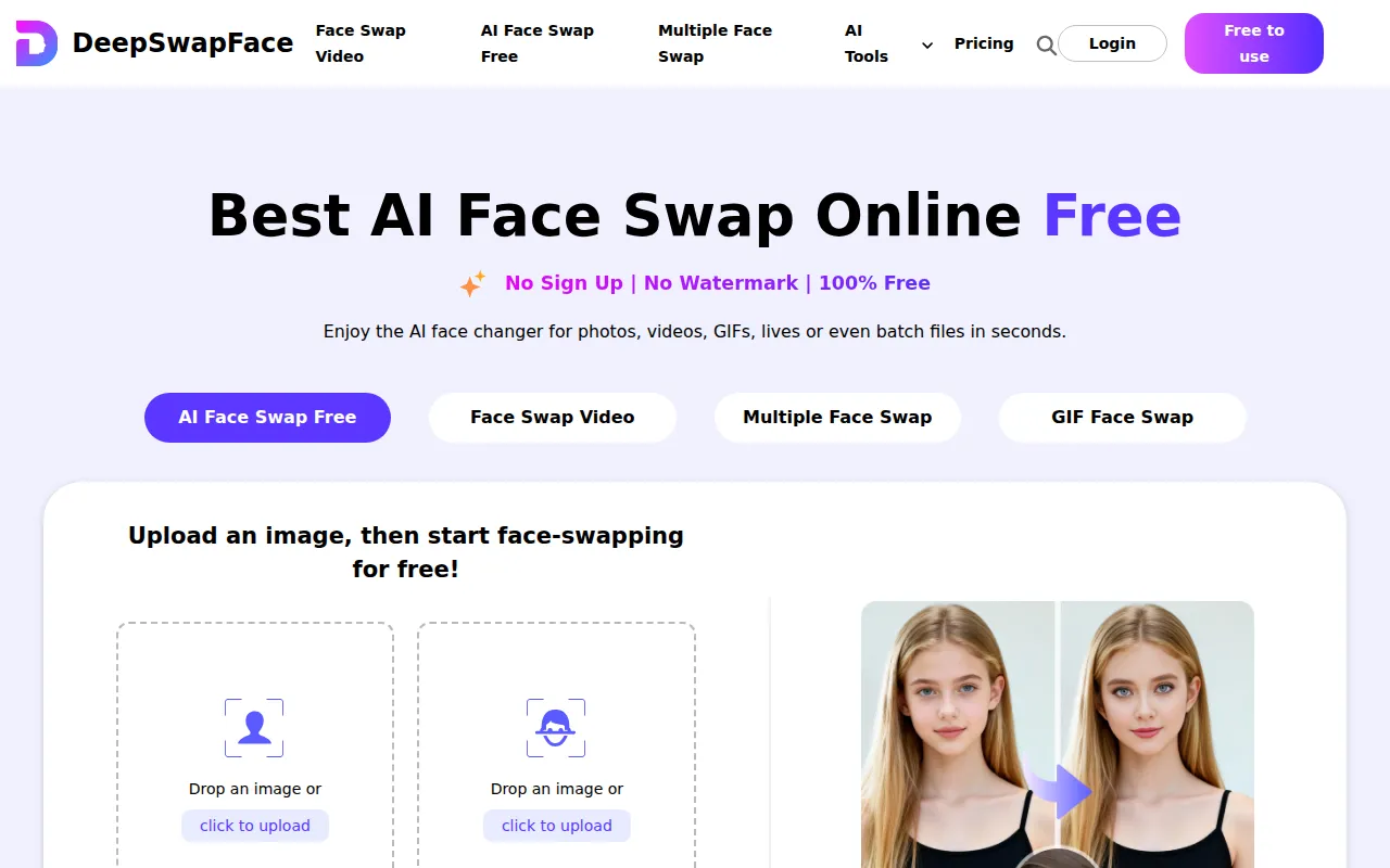 DeepSwapFace is a next-generation, AI-powered online platform that lets you seamlessly swap faces and bodies in any photo, video, or GIF—instantly, for free, and without any sign-up. It's described as the best free AI face swap online, combining power and accessibility.