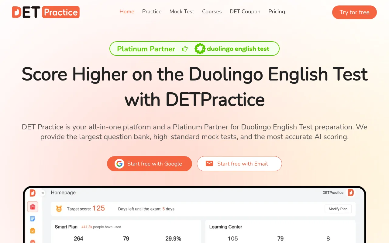 DET Practice offers comprehensive Duolingo English Test preparation with extensive questions and AI scoring.