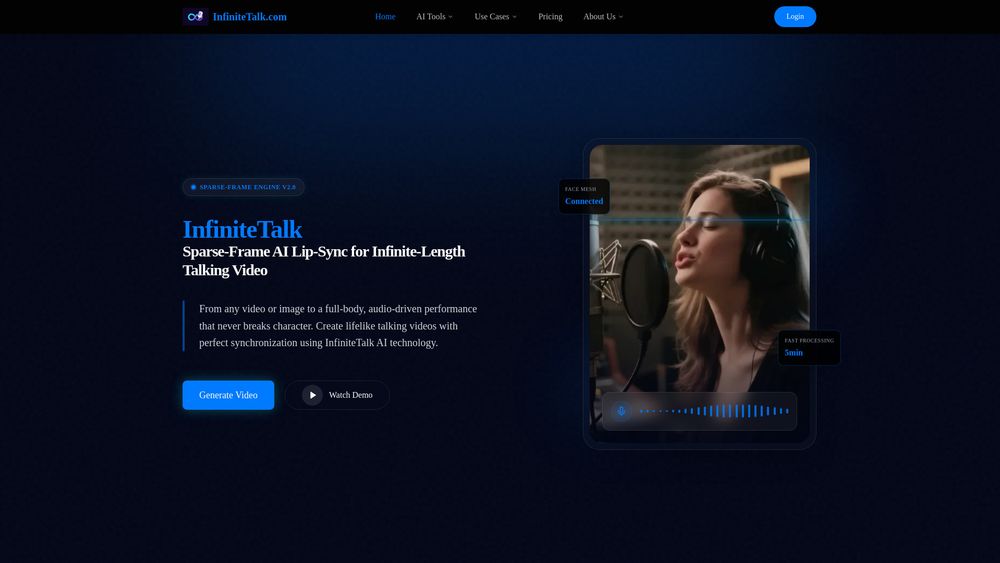 InfiniteTalk is an AI-powered lip-sync talking video generator that creates lifelike, infinite-length performances from any image or video. It utilizes a Sparse-Frame AI engine to achieve perfect synchronization, including head movements, body posture, and micro-expressions, while minimizing distortions.