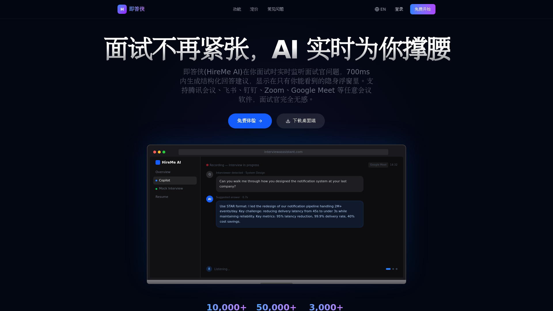 - Will interviewers know I'm using 即答侠? No, the desktop application uses system-level stealth technology. The floating window is invisible during screen sharing and recording, and it does not appear in the taskbar or Alt+Tab. Interviewers cannot detect its use.