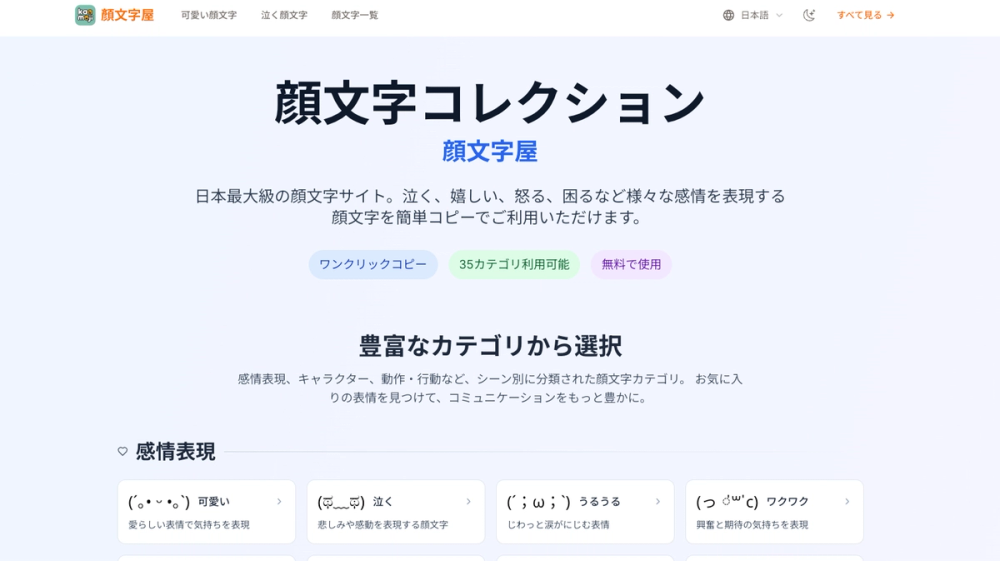 Browse thousands of text faces organized into categories like cute, happy, sad, angry, love, cat, dog, and many more. Simply click any kaomoji to copy it to your clipboard instantly.