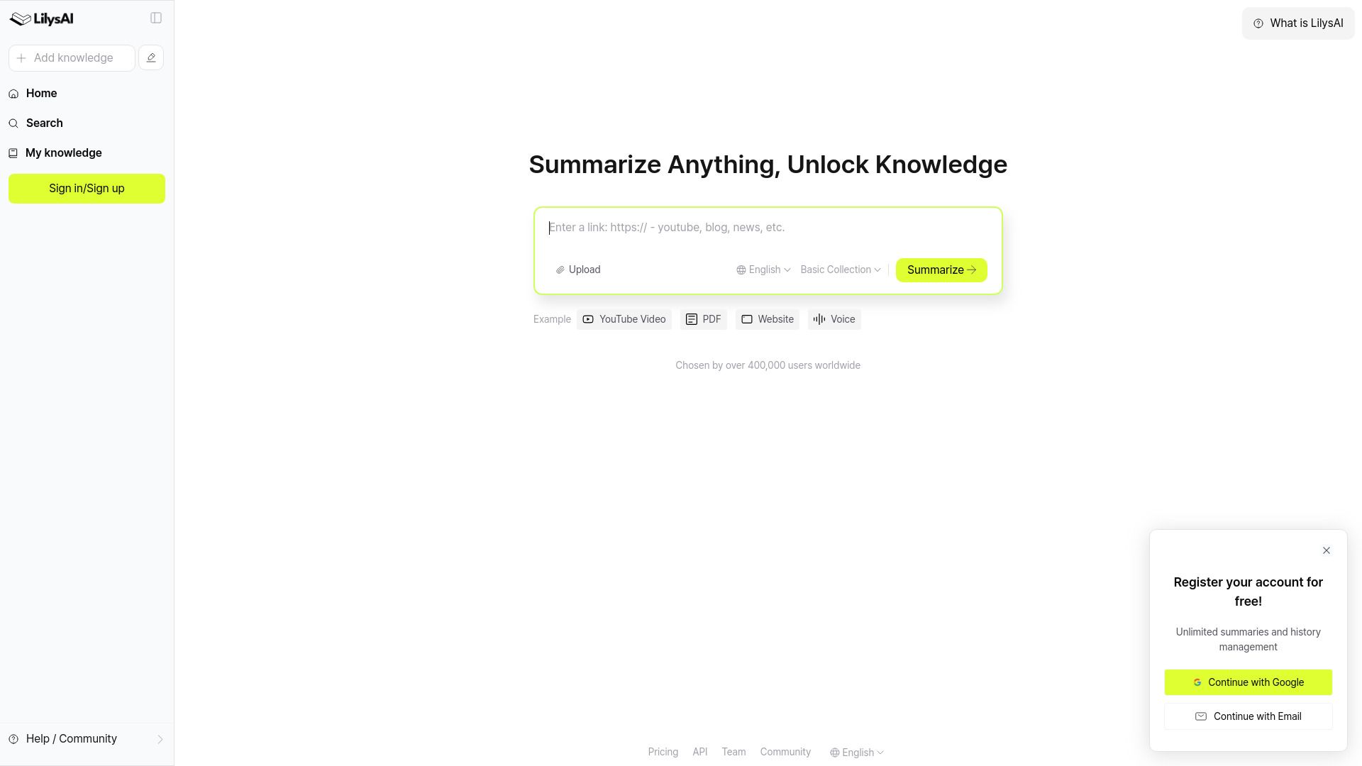 Lilys AI is an AI tool designed for summarizing various types of content, including videos, audio, PDFs, and websites.