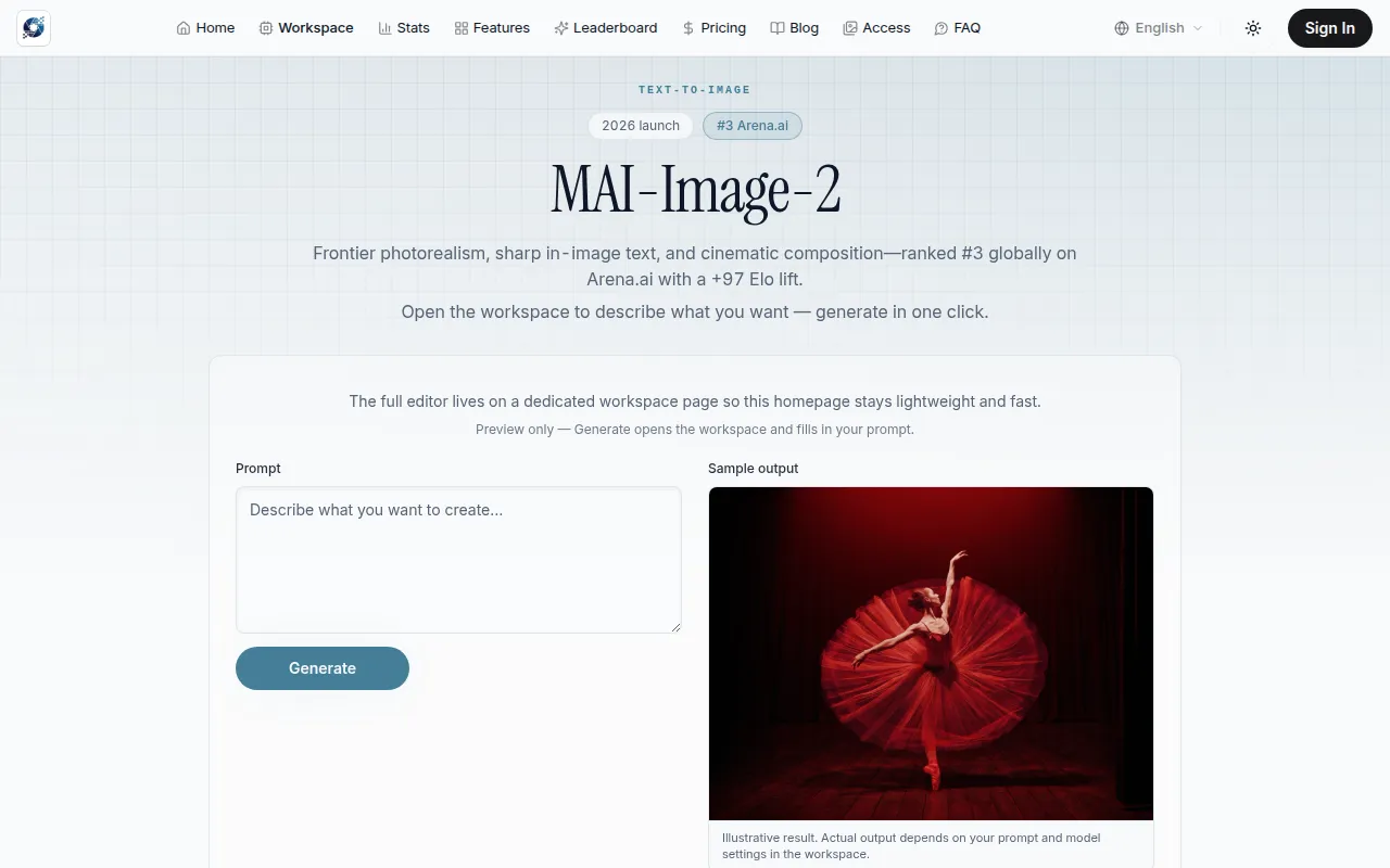 MAI-Image-2 is a photoreal text-to-image AI model producing readable in-image text and cinematic compositions for production visuals.