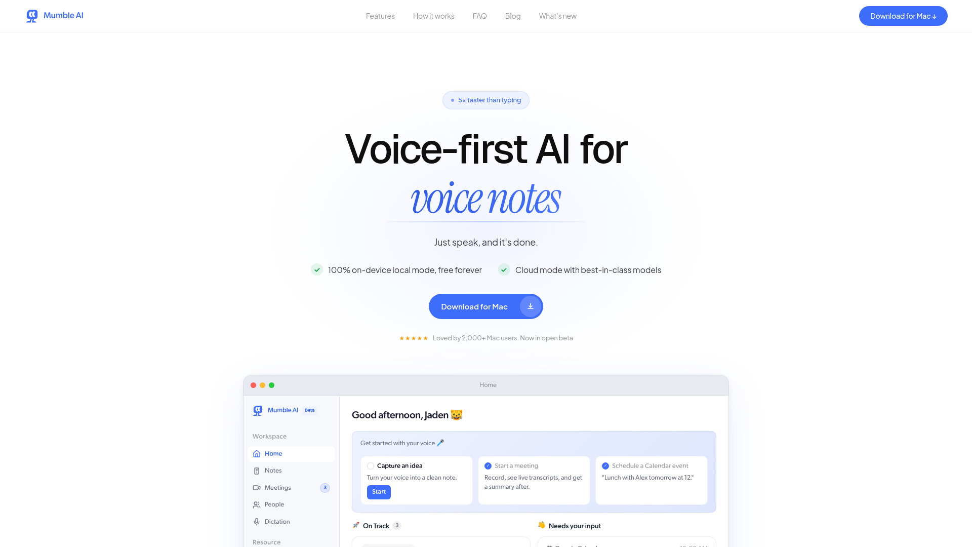 Mumble AI is a voice-first productivity app for Mac that combines meeting recording, dictation, agent, and voice notes in one place. It aims to be 5x faster than typing and offers both cloud and on-device processing options.