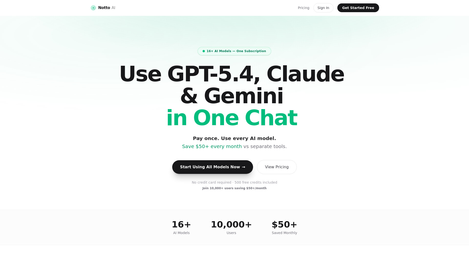 Notto AI is a unified AI chat platform that provides access to over 16 premium AI models, including GPT-5.4, Claude, and Gemini, all under a single subscription.