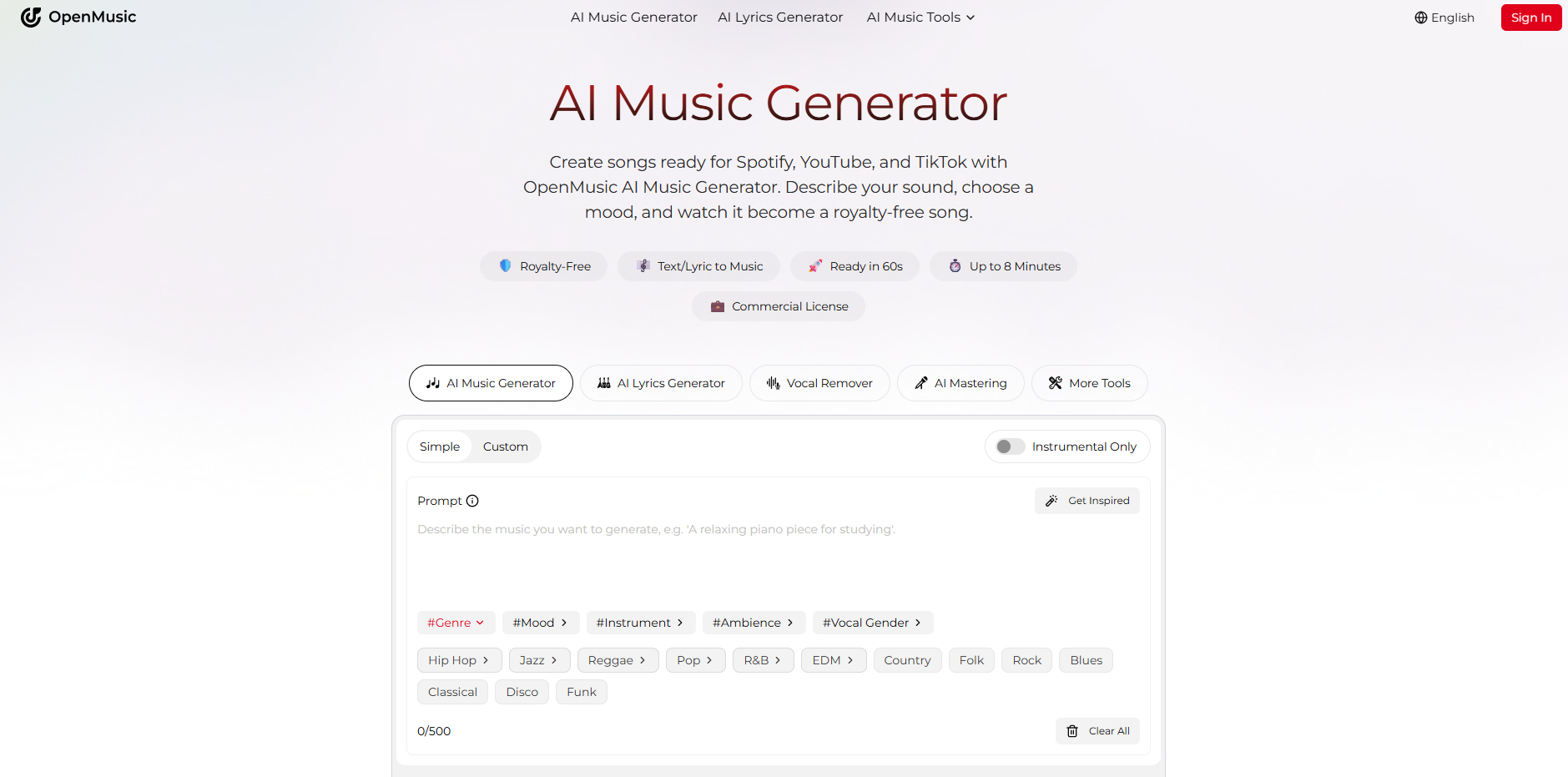 OpenMusic AI is a comprehensive AI music creation platform that turns simple ideas into full, professional-quality songs in seconds. Users can generate original tracks from text prompts or lyrics, select genre and mood, and access an all-in-one toolkit that includes AI audio mastering, vocal removal, stem separation, and lyric generation. Every composition is 100 percent royalty-free with commercial licensing, ready for use on platforms such as Spotify, YouTube, TikTok, podcasts, games, or films without copyright concerns. Designed for creators at any skill level, OpenMusic AI empowers artists, producers, and storytellers to realize and refine musical ideas faster and more efficiently than traditional production workflows.