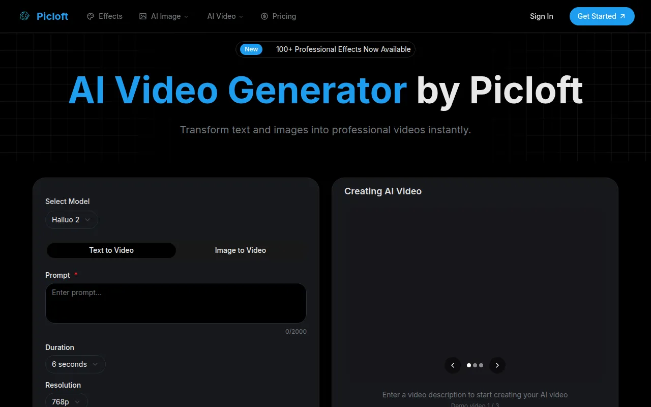 Picloft offers AI-powered video creation from text and images with multiple models and effects.