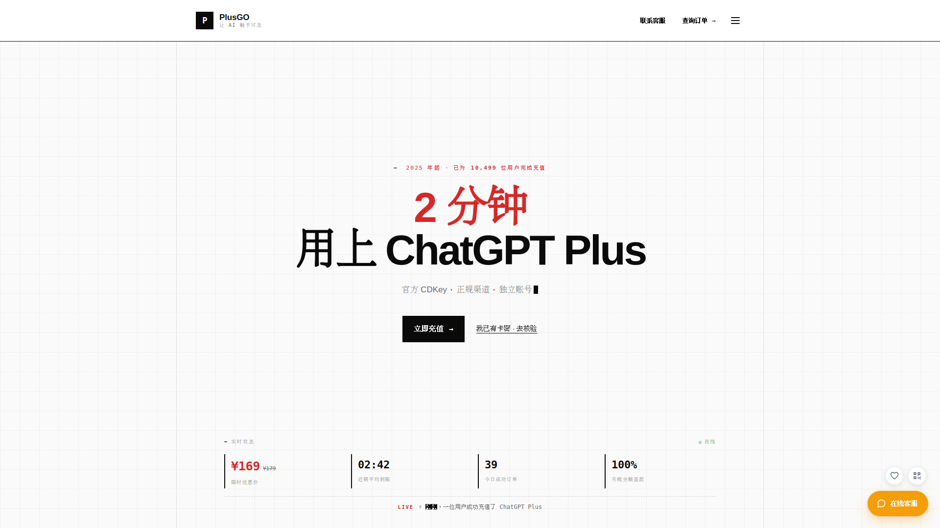 PlusGO is a fast, card-free ChatGPT Plus top-up service specifically designed for Chinese users. It offers a convenient way to upgrade to ChatGPT Plus using local payment methods.