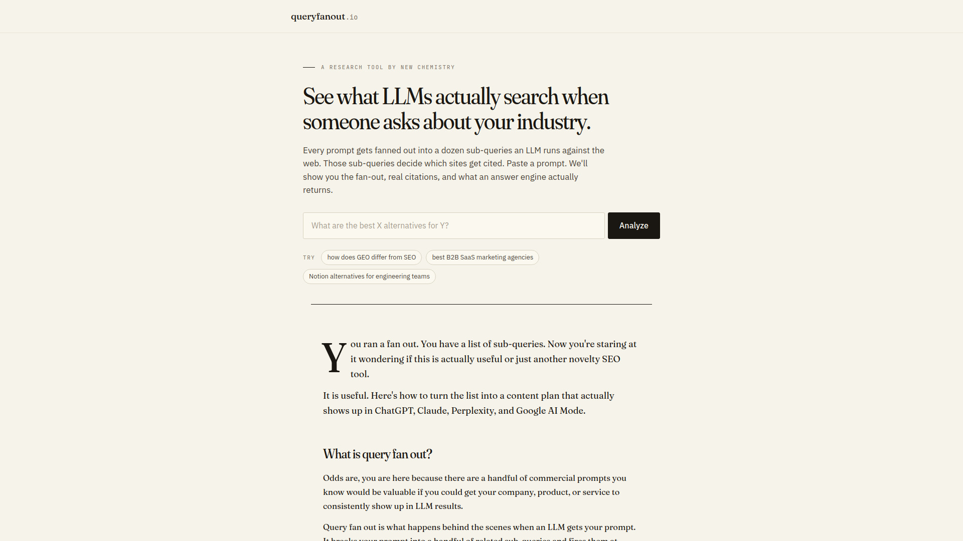 Keyword research focuses on what humans type into search engines. Query Fan-Out Optimizer reveals what LLMs type into search engines after receiving a human's prompt, offering a different layer of leverage for visibility.
