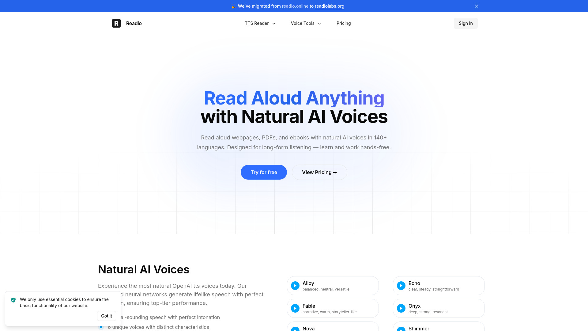 - What voices do you use? Readio uses natural AI voices, including specific mentions of OpenAI TTS voices, and offers 6 unique voices.