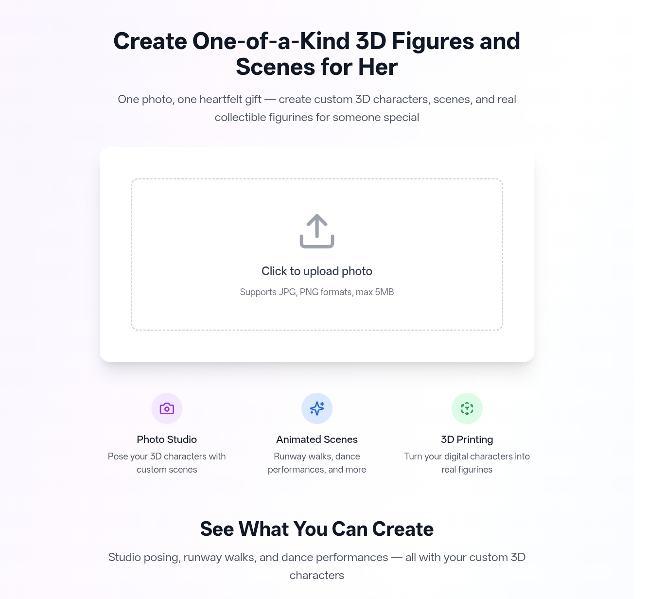 Turn photos into custom 3D characters, interactive scenes, and 3D-printed figurines.