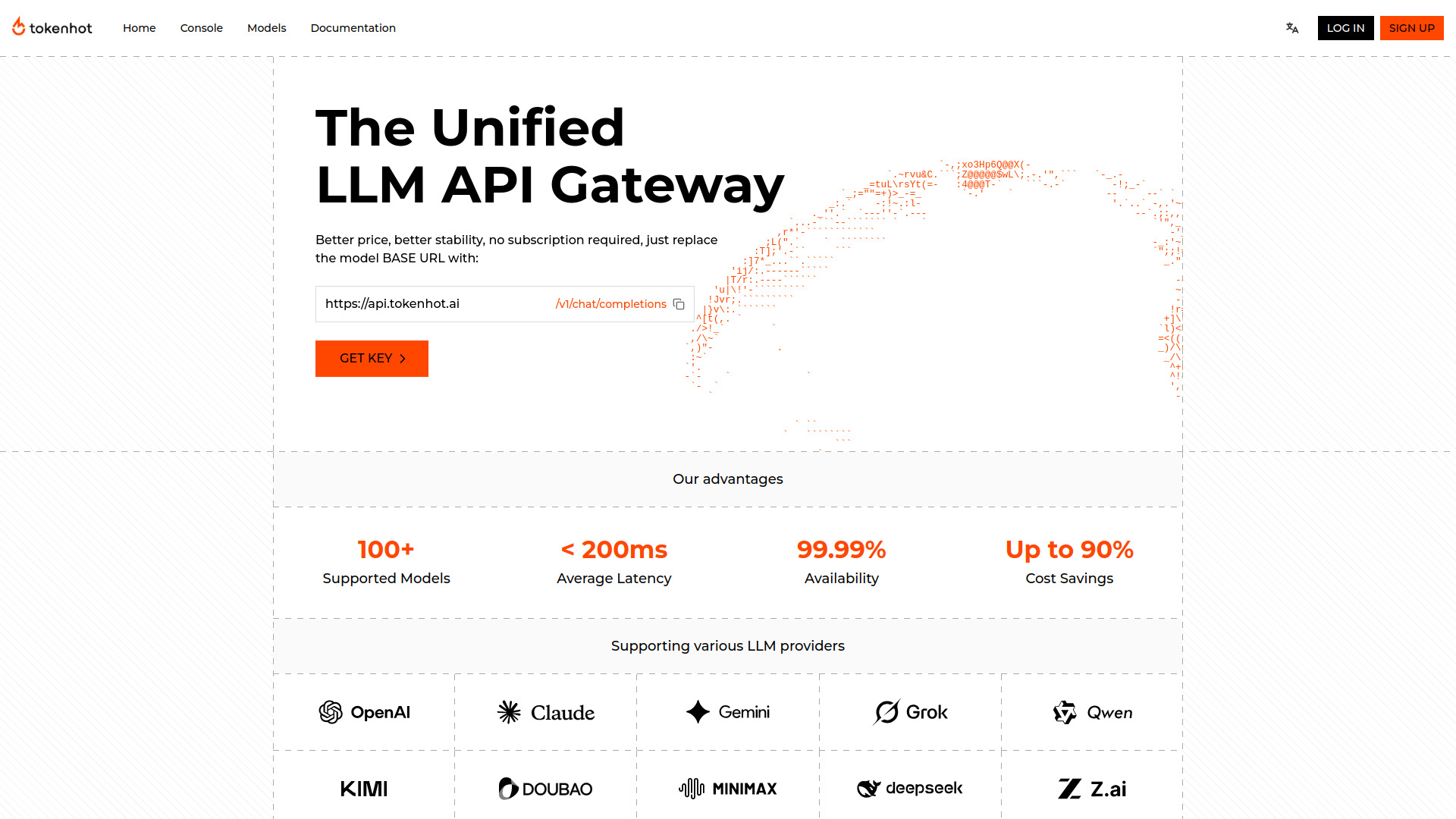 Unified LLM API gateway for 100+ models with up to 90% cost savings.