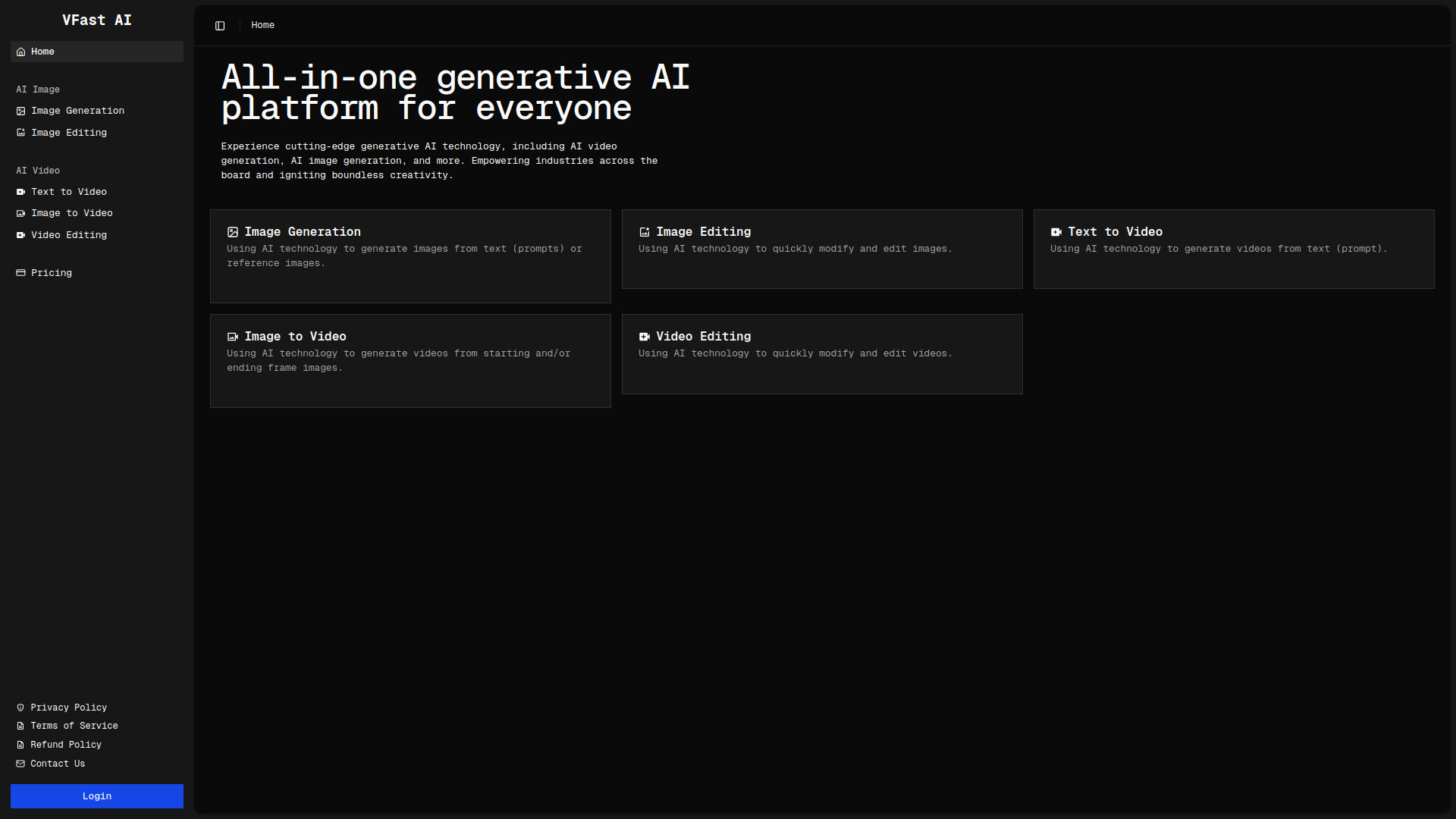 VFast AI is an all-in-one generative AI platform designed for the creation and editing of images and videos.