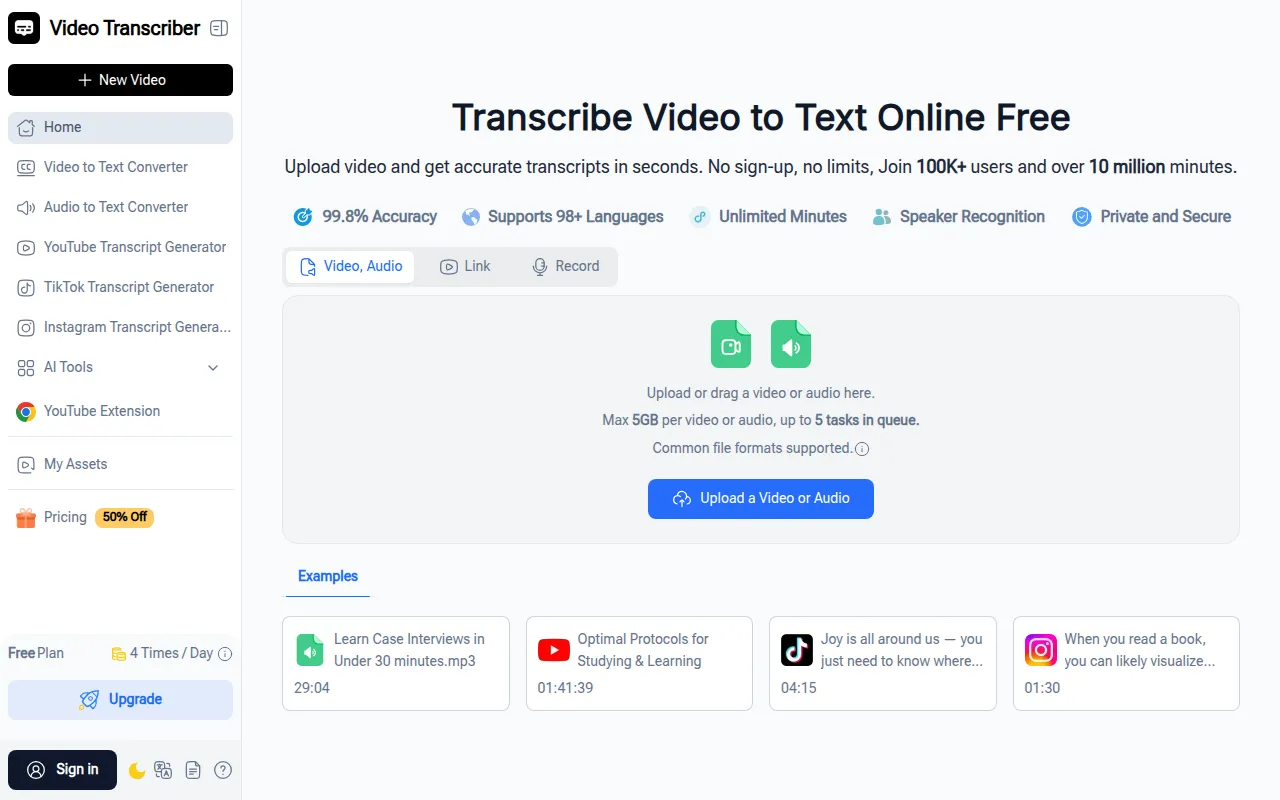 Fast, free online tool to transcribe videos to accurate text in seconds.